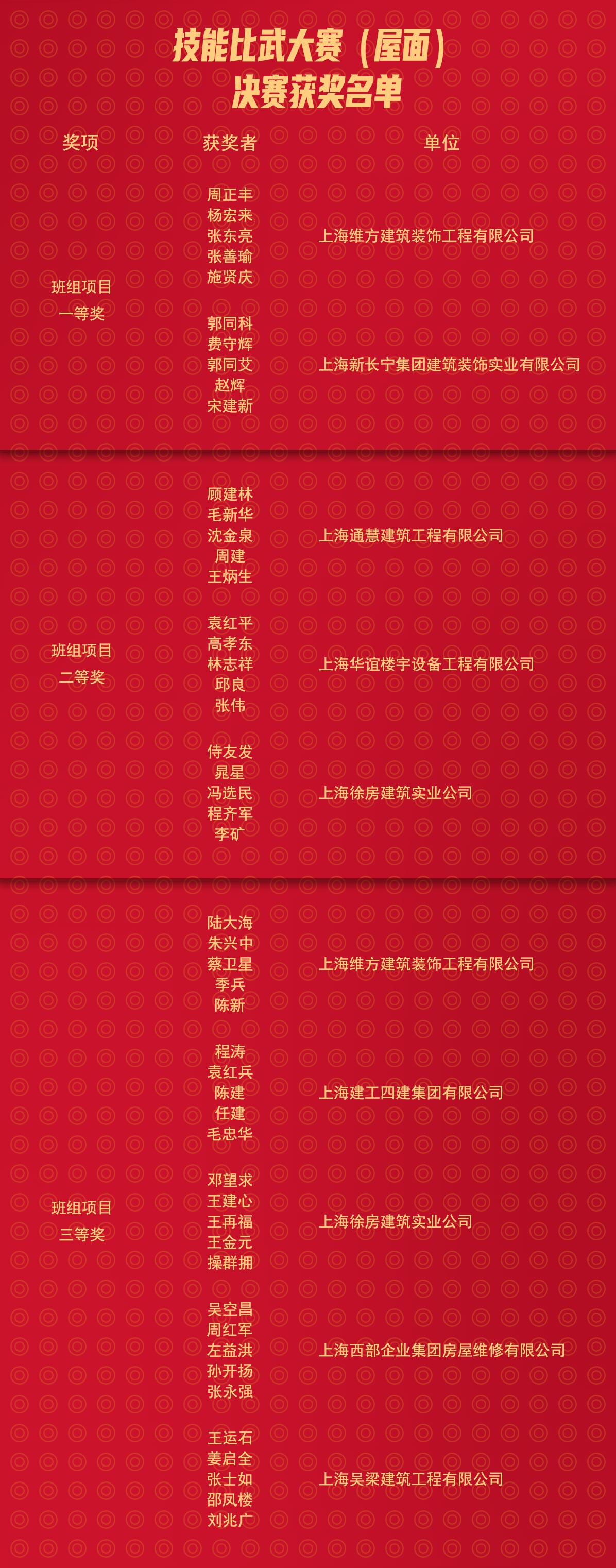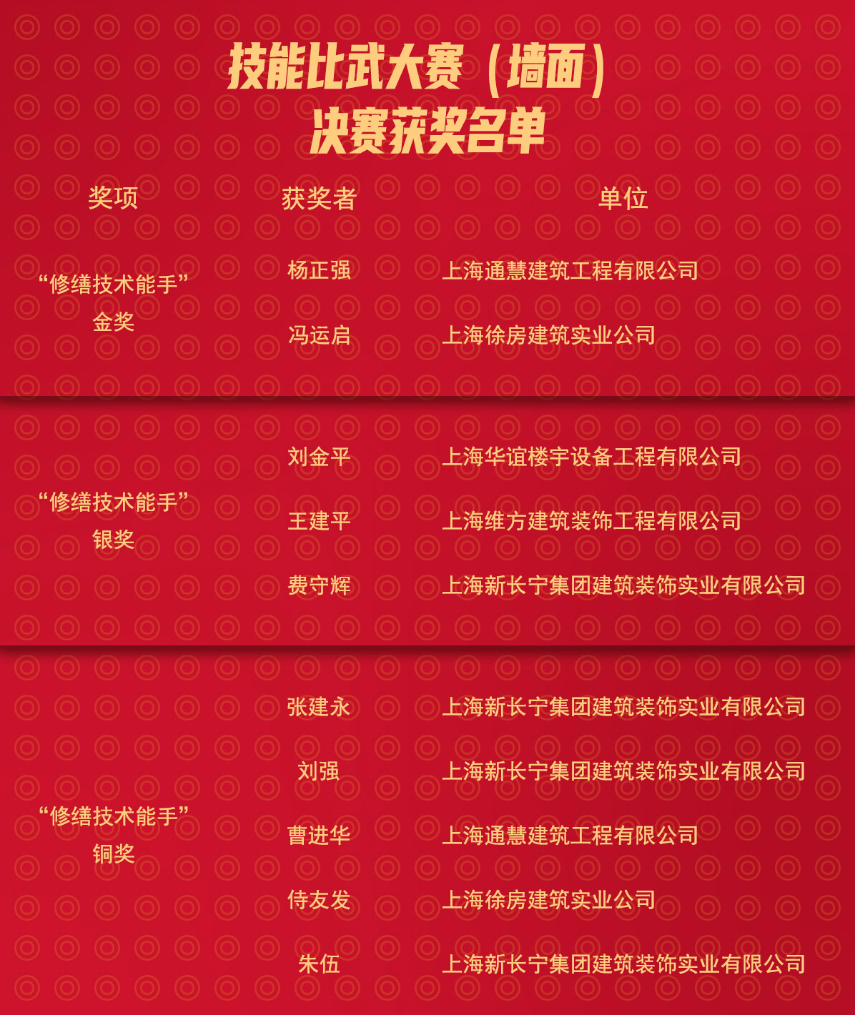 最終比賽獲獎名單出爐,上海維方建筑裝飾工程有限公司斬獲“修繕技術(shù)能手” 銀獎(個人)和班組項目一等獎、三等獎共計三個獎項。
